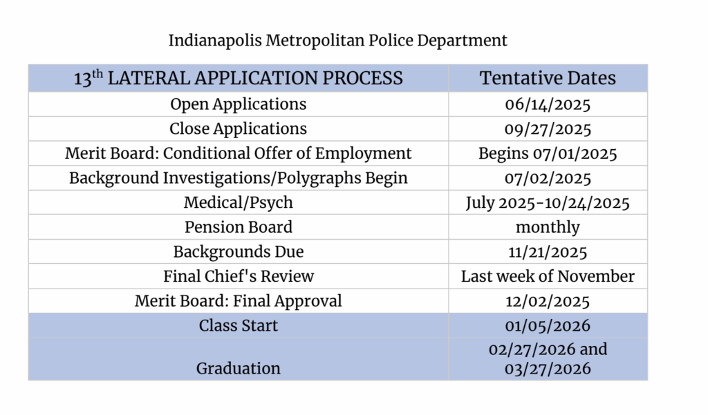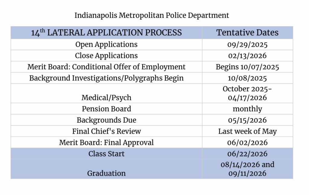 Lateral Police Officer candidates are experienced full-time police officers currently employed by other municipal, county, or state agencies, as a law enforcement officer, with Indiana Law Enforcement Training Academy Certification Tier 1. Lateral Applicants are required to be in good standing with their current agency.